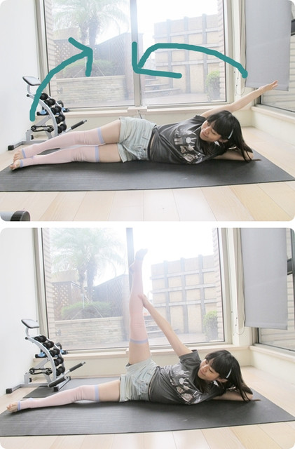 當腿往上時!!手也要同時抓住腳!這同時可以訓練大腿內側的肉肉還有臀部以外!手臂也可以順便一起瘦下來