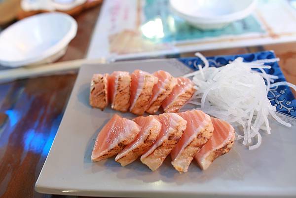 炙燒鮭魚片,這盤真的不輸大餐廳,鮭魚的表皮約莫0.5公分是熟的,其餘都是維持生魚片的狀態,一口咬下層次很豐富,