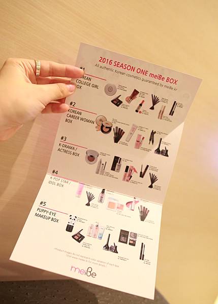 MEIBE BOX每一期都有不同的美妝盒主題,像這一期就有"大學系校園韓妞風"、"輕熟韓風小資女"、"變身韓劇最紅女主角"、"韓國最紅KPOP女神"、"萌系韓娃無辜妝"